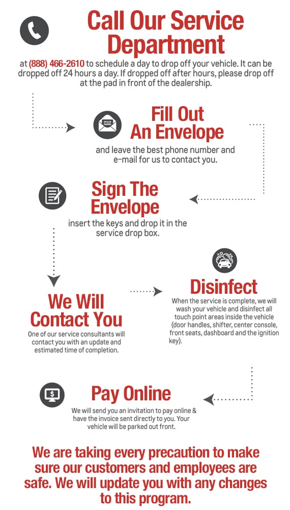 Our team is ready to assist you! We have enhanced our handling techniques and are paying special attention to interior vehicle touch points; in both service loaners and customer vehicles. We are also offering complimentary Service Pick Up And Delivery from your home or workplace.